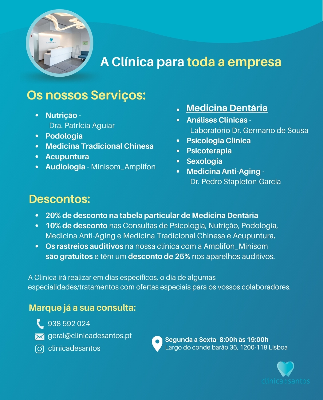 A Clínica de Santos realiza, em dias específicos e a definir, o dia de algumas especialidades/tratamentos com ofertas especiais para os associados APAP.