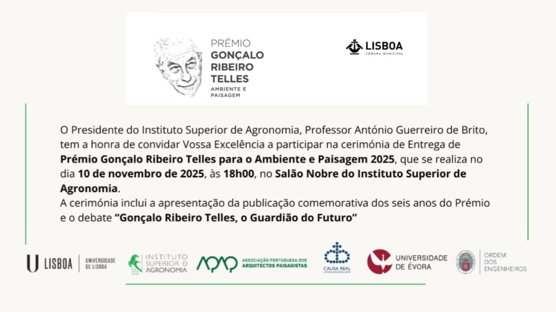 O júri do Prémio Gonçalo Ribeiro Telles Ambiente e Paisagem e a família do Prof. Gonçalo Ribeiro Telles convidam os associados e amigos da APAP a participar na cerimónia de Entrega do Prémio a realizar-se-á no próximo dia 10 de Novembro no Salão Nobre do Instituto Superior de Agronomia, pelas 18h00. Este ano e com o generoso apoio da Câmara Municipal de Lisboa, será apresentado, publicamente, um livro alusivo aos seis anos que este prémio já possui.