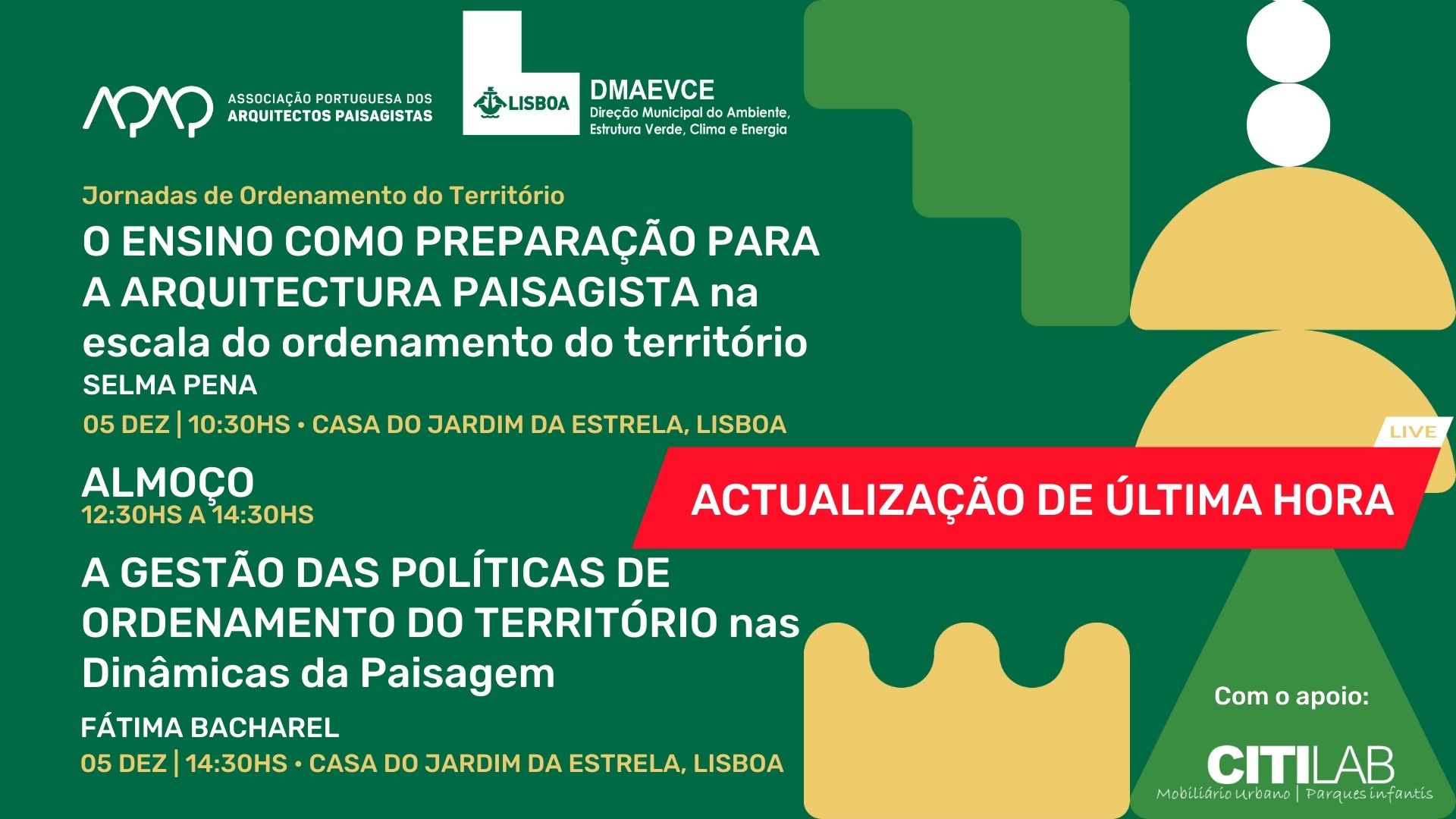 Jornadas de Ordenamento do Território: 5ª sessão O ENSINO COMO PREPARAÇÃO PARA A ARQUITECTURA PAISAGISTA na escala do ordenamento do território Com Selma Pena 05 dez | 10hs30 • Casa do Jardim da Estrela, [...]