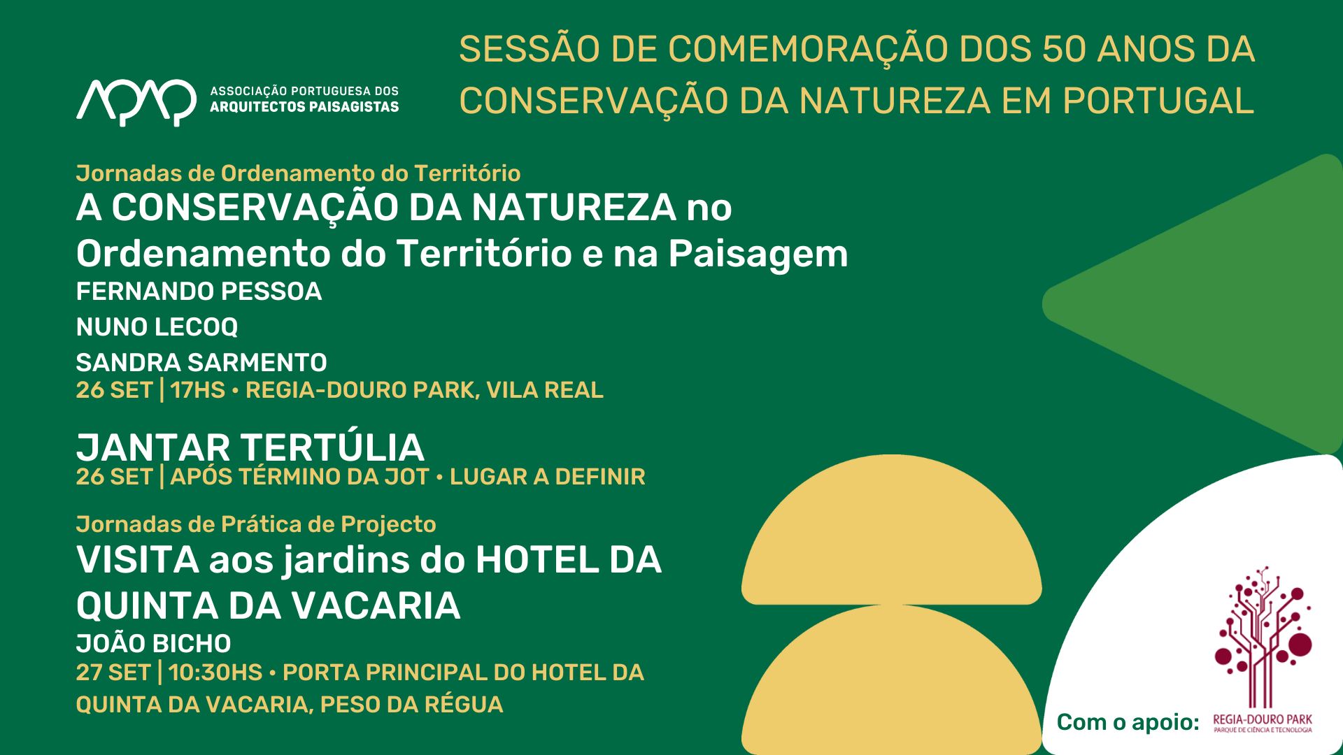 SESSÃO DE COMEMORAÇÃO DOS 50 ANOS DA CONSERVAÇÃO DA NATUREZA EM PORTUGAL Jornadas de Ordenamento do Território: 3ª sessão A CONSERVAÇÃO DA NATUREZA no Ordenamento do Território e na Paisagem, com Fernando Pessoa, Nuno Lecoq e Sandra Sarmento [...]